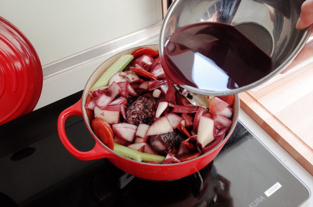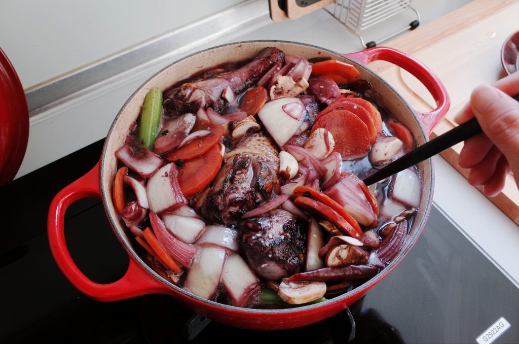 4. 把煎好的雞腿放入鑄鐵鍋中,加入前一晚的醃料食材(紅酒要先濾出到另一個容器中備用),稍微拌炒一下後,再將過濾乾淨的醃料紅酒加入鍋中,大火煮滾。
