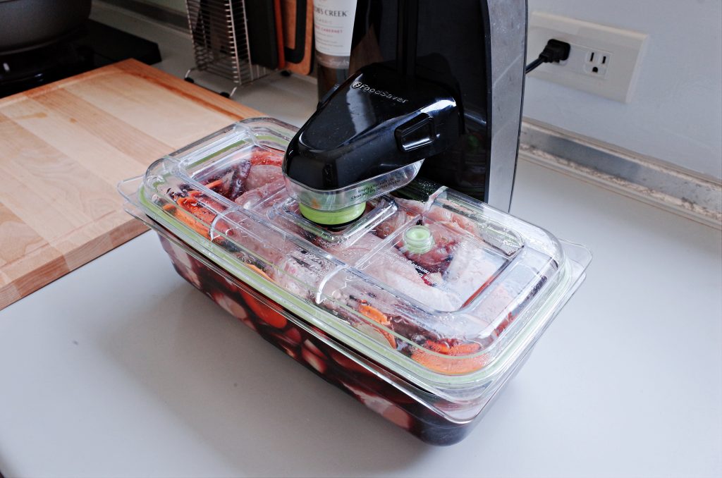 1. 前一天晚上把所有的醃料丟進密鮮盒或是任何可以醃的容器,洋蔥切大塊、紅蘿蔔切片,一起醃至隔夜即可。(我自己是醃了24小時,在法國如果醃全雞的話要醃兩天才會入味噢!)沒有密鮮盒的朋友,可以直接用大的夾鏈袋,像是IKEA那種,或是自己家裡有的保鮮盒也都一樣可以醃製噢!