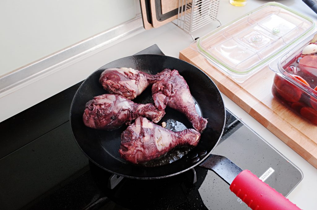 2. 隔一天取出醃好的雞腿,用鐵鍋煎,將雞皮面朝下煎出雞油。