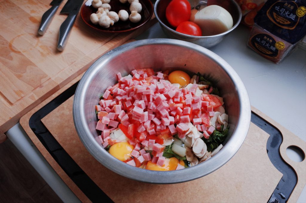 1. 將茼蒿切碎、火腿切小丁、牛番茄切丁、洋蔥切丁、蘑菇切片,加上雞蛋和鮮奶油,一起攪拌均勻成烘蛋餡料。