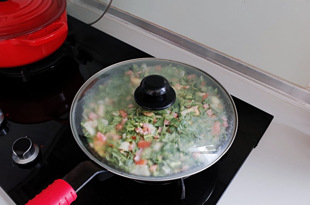 🔹食材: 雞蛋5顆、牛番茄1顆、山茼蒿一大把(看自己喜好斟酌)、洋蔥1/2顆、蘑菇約10小顆、火腿4片、乳酪絲適量