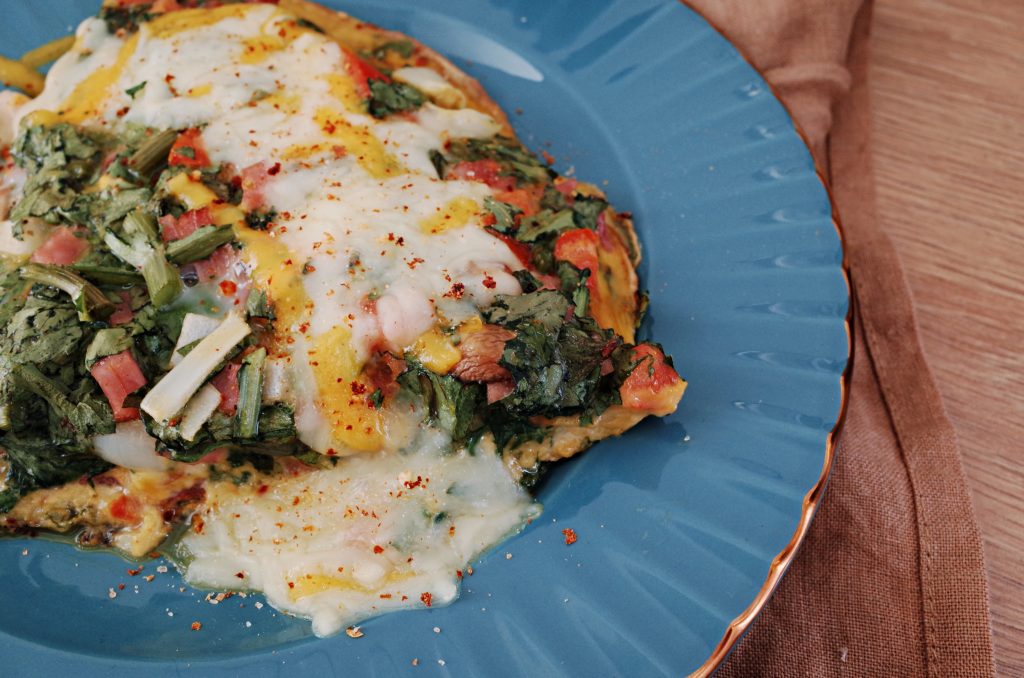 先森說沒想到茼蒿做成烘蛋也很好吃,味道完全很可以!我自己吃是喜歡加很多起司,所以當天中餐時,我取出烘蛋以後,又再次在上面撒上更多乳酪絲,直些放進烤箱裡烤一下,牽絲濃郁的乳酪絲和烘蛋就是胎胎我的最愛啊!不得不說,用山茼蒿做烘蛋,比起以前在美國用菠菜做烘蛋,整個有種像是在山上很好吃的野味山料理,而且不知道是不是用山茼蒿的關係,吃起來不只味道好,也比平常吃烘蛋還要飽足,真的是很奇妙又好吃的組合XDDD