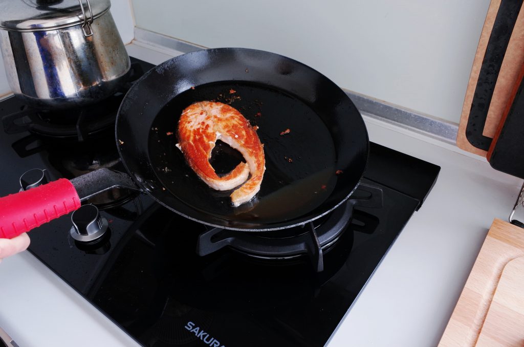 我用30cm碳鋼鍋煎魚,只放了一點點油,小火慢煎的煎出超多鮭魚油,我有特地把鍋子拿斜的拍照讓大家看,每個步驟胎胎都有拍的很超清楚,大家可以看到照片上的鮭魚煎的超酥脆,一看就知道超好吃的那種!