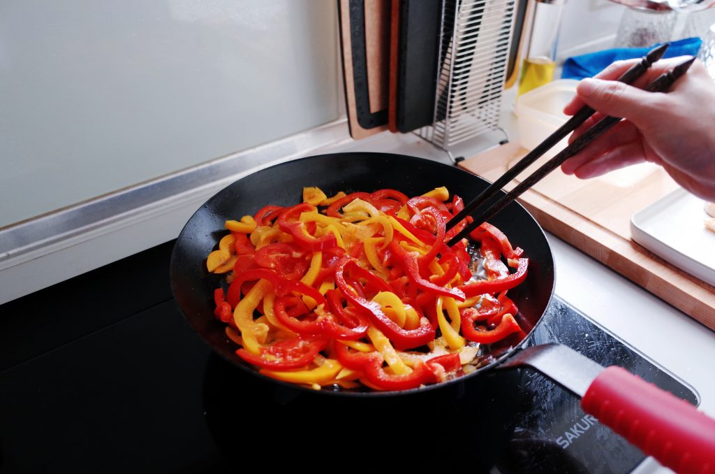 當天我把煎出來的鮭魚油濾掉一半,剩下的直接炒兩顆甜椒+一大把菠菜給先生當隔天的晚餐便當,30cm 碳鋼鍋真的不是蓋的,可以放的菜真的很多,雖然鍋邊不深,但也不會炒出去(這點蠻奇妙的)。